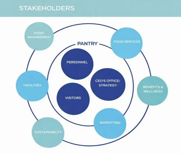 Employees would have the option to pick up food from stalls in the main pantry area or smaller satellite areas throughout the building. Specialty food carts throughout the pantry would offer feature tastings.